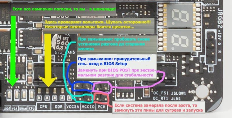 Здесь имеются контактные площадки для подключения мультиметров: фанаты могут проверять реальные напряжения на ядре CPU, контроллере ввода-вывода CPU, памяти, чипсете и др. Также есть блок перемычек. OC_RT1 — для упорных повторов загрузки системы с ранее установленными параметрами разгона (до 3х раз) на предмет: а вдруг оно заведется?! OC_FS1 — при замыкании заставляет систему после перезагрузки автоматически входить в BIOS Setup (без воплей о том, что все плохо, «гипс снимают, клиент уезжает..»). JSLOW1 — замкнуть, если применили очень экстремальное охлаждение, повышается стабильность (правда не объяснили — за счет чего). И JLN1 — это если ...