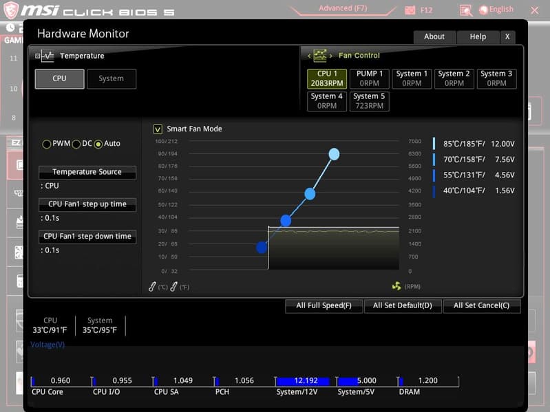 Закладка мониторинга не только просто демонстрирует температуры и частоты вращения вентиляторов, но и дает возможность управлять работой вентиляторов. Ранее я писал, что на плате есть 7 разъемов для подключения оных. И каждый из них имеет возможность управления из BIOS (можно выставить режим контроля: через ШИМ или напрямую), также можно наглядно выставить контрольные точки работы вентиляторов в зависимости от нагрева.
