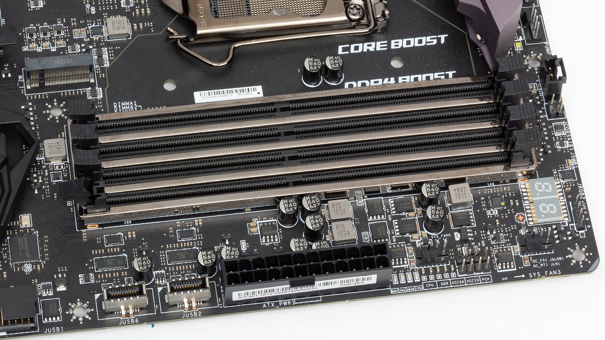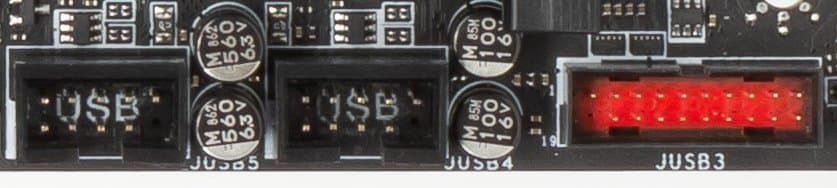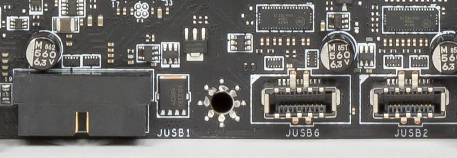 - 4 порта USB 3.1 Gen1 (USB 3.0): реализованы через контроллер ASM1042 от ASMedia и представлены 2 внутренними разъемами на материнской плате (один из них JUSB1 виден выше, слева от Type-C);