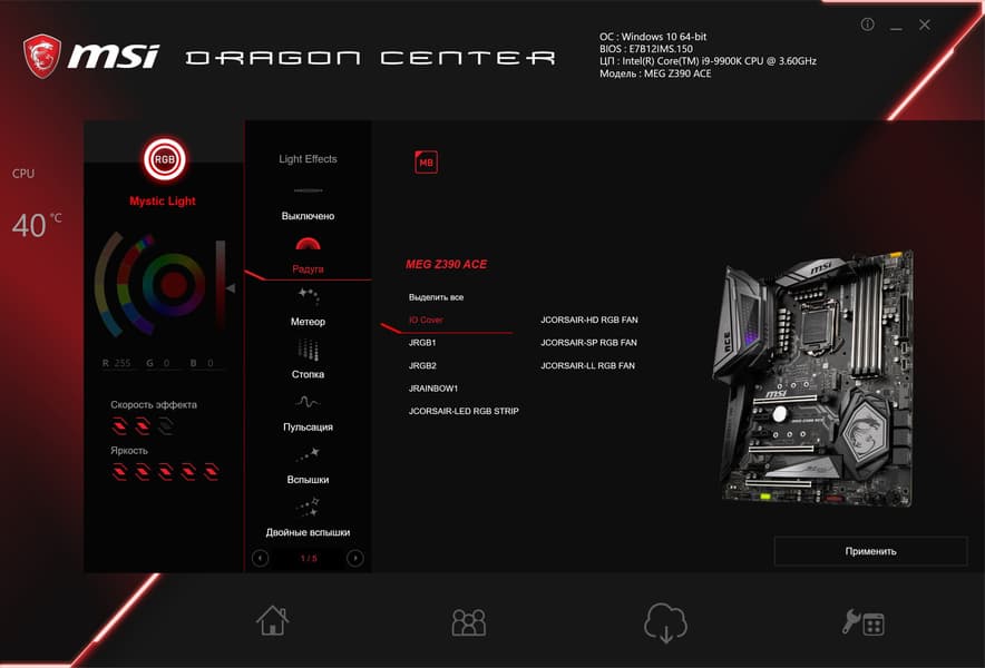 При этом мы видим отменную функциональность: 20 (двадцать!) портов USB всех калибров, прекрасно защищенные слоты PCI-E, три слота M.2. Стоит отметить очень хорошую систему питания, дающую ощутимый запас для разгона и обеспечивающую гибкие возможности регулирования напряжений. 7 разъемов для вентиляторов позволяют организовать какую угодно систему охлаждения ПК в целом, при этом есть гибкая система контроля за работой каждого вентилятора! Стоит добавить, конечно, и эстетику: красивая подсветка самой платы плюс широкие возможности для подключения дополнительных RGB-устройств, включая проприетарные решения Corsair. Также отметим очень толково спроектированную утилиту Dragon Center, которая позволяет многое без установок многочисленных дополнительных программ, включая и некоторые возможности для разгона системы. Можно еще упомянуть поддержку быстрой зарядки мобильных гаджетов через порты USB Type-C.