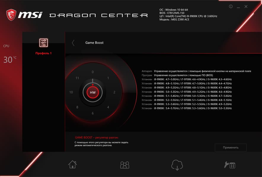 Вот здесь мы подошли к тому самому «барабану» Game Boost, что ранее нам попадался на материнской плате. Как через Dragon Center, так и через BIOS/UEFI можно выбрать: управлять этими пресетами будем аппаратно или программно: то есть просто методом физического переключения «барабана» либо смена пресета будет идти программным путем