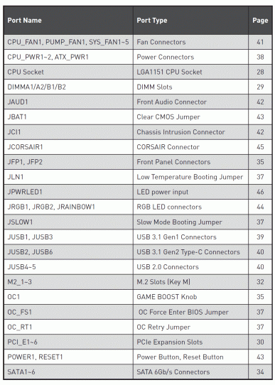 | Прочие внутренние элементы | 24-контактный разъем питания ATX 2 8-контактных разъема питания ATX12V 1 слот M.2 (E-key), занят адаптером беспроводных сетей 2 разъема для подключения портов USB 3.1 Type-C 2 разъема для подключения 4 портов USB 3.1 Gen1 2 разъема для подключения 4 портов USB 2.0 7 разъемов для подключения 4-контактных вентиляторов (поддержка помп ЖСО) 1 разъем для подключения адресуемой RGB-ленты 2 разъема для подключения неадресуемой RGB-ленты 1 разъема для подключения RGB-подсветки от Corsair 1 разъем аудио для передней панели корпуса 1 перемычка для повтора загрузки в режиме разгона 1 перемычка для запуска системы в случае чрезмерного охлаждения 1 перемычка для принудительного входа в BIOS Setup 1 перемычка для повышения стабильности загрузки при экстремальном разгоне 1 кнопка включения питания (Power) 1 кнопка перезагрузки (Reset) 1 переключатель режимов разгона (Game Boost) 1 перемычка сброса CMOS 1 разъем сигнала открытого корпуса системного блока |