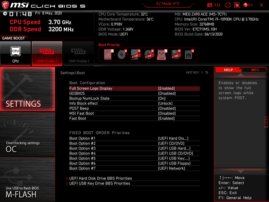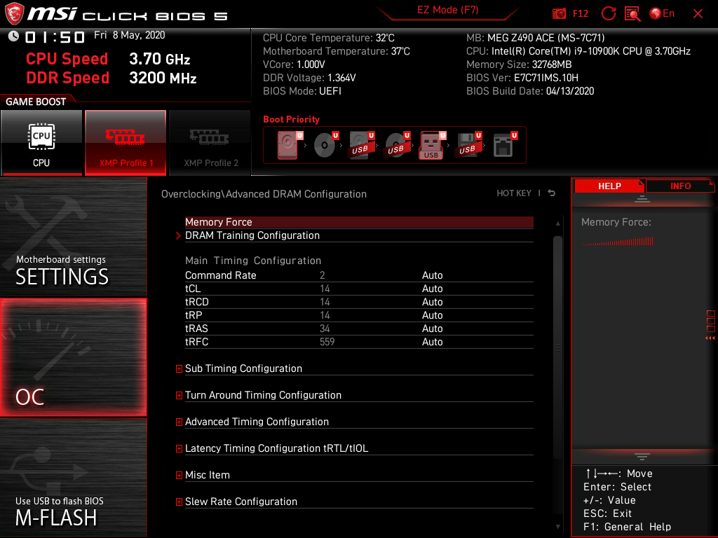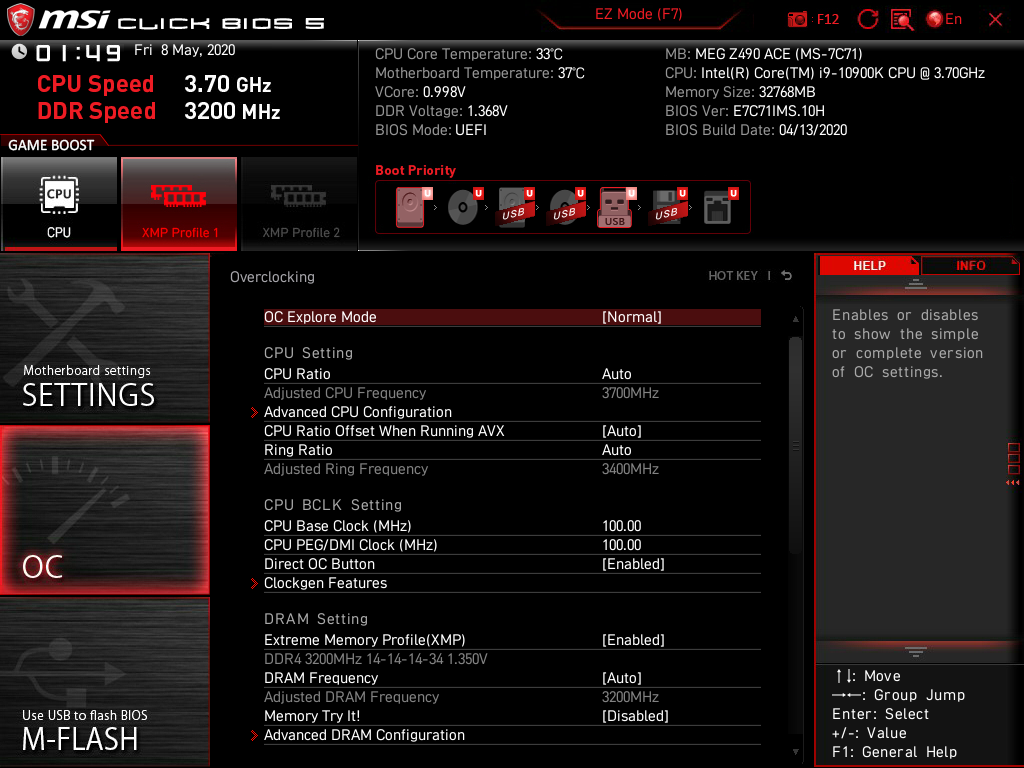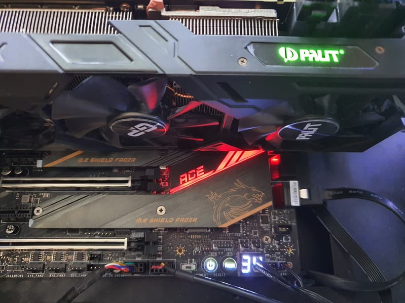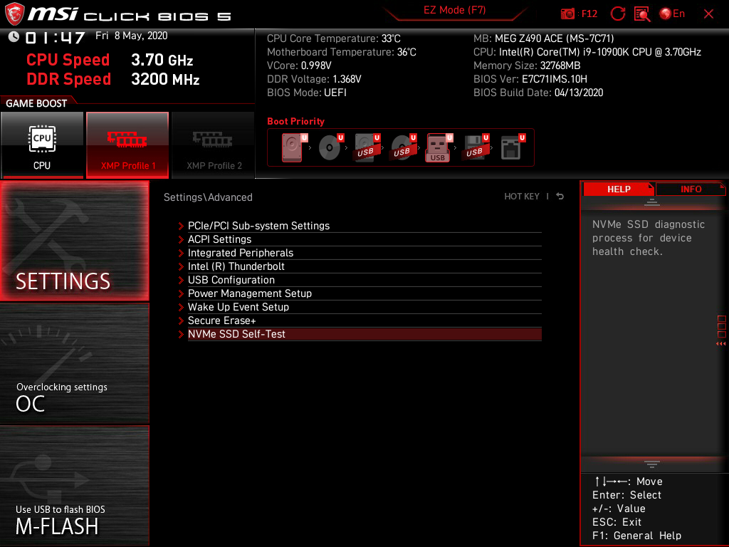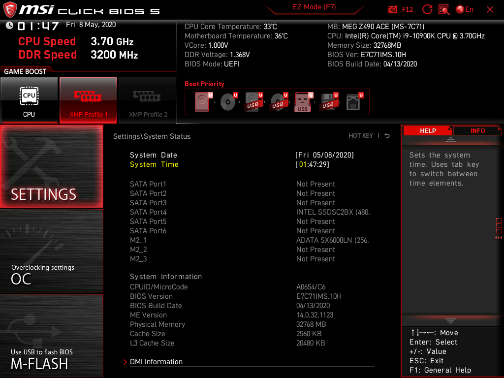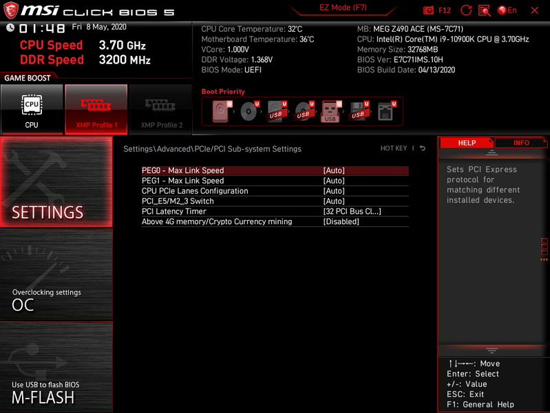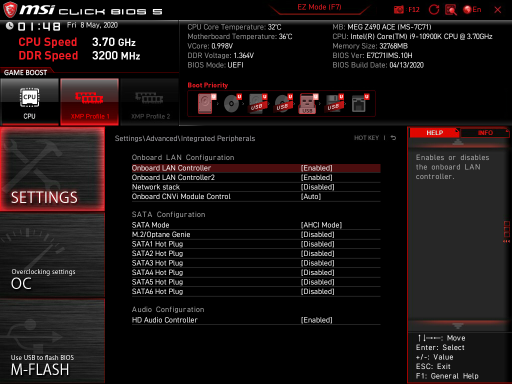 Функциональность у MSI MEG Z490 Ace — на высоте! Имеем 15 портов USB разных видов (включая 4 очень быстрых USB 3.2 Gen2 и 1 порт USB 3.2 Gen2×2 с удвоенной скоростью), 3 слота PCIe х16 (первые два получают 16 линий PCIe от процессора с возможностью создать Nvidia SLI или AMD CrossFire, а третий работает только в режиме х4), 3 слота M.2, 6 портов SATA. Система питания процессора включает 16 фаз для ядра и способна обеспечить работу любых совместимых процессоров для нового сокета LGA1200 под серьезным разгоном (авторазгон по умолчанию смог понять частоту с 3,7 до 4,8 ГГц по всем ядрам). Плата имеет радиаторы на силовых элементах системы питания (усиленные комплектным вентилятором, который, кстати, ни разу не запускался), 8 разъемов для подключения вентиляторов и помп, также радиаторами оснащены все накопители в слотах M.2. Дополняют картину два проводных сетевых контроллера, включая один 2,5-гигабитный, и беспроводной контроллер, реализующий Wi-Fi 802.11ac и Bluetooth 5.0.