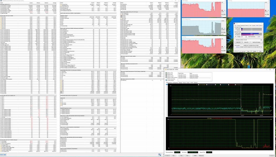 Плата обладает прекрасной системой питания, плюс настройки UEFI по умолчанию, и MCE (вместе с Intel TurboBoost) сразу поднял частоты всех ядер до 5,2 ГГц. Конечно же, видно, что процессор уже на грани перегрева по некоторым ядрам, однако троттлинг появился сильно позже, причем уже на Adobe Premiere. Остальные вышеуказанные тесты прошли без проблем. Температурные параметры у всех остальных элементов матплаты — в норме (блок VRM и чипсет Z490 не нагревались выше 50-55 °C), необычных явлений не замечено. Разумеется, защита от перегрева сработала и понизила частоты до 5,0 ГГц, однако уже частоты по ядрам стали меняться. Максимальное потребление процессором достигло величины в 255 Вт (сравните с декларируемой величиной TDP. Смешно, правда?), очевидно, что нужна еще более мощная ЖСО.