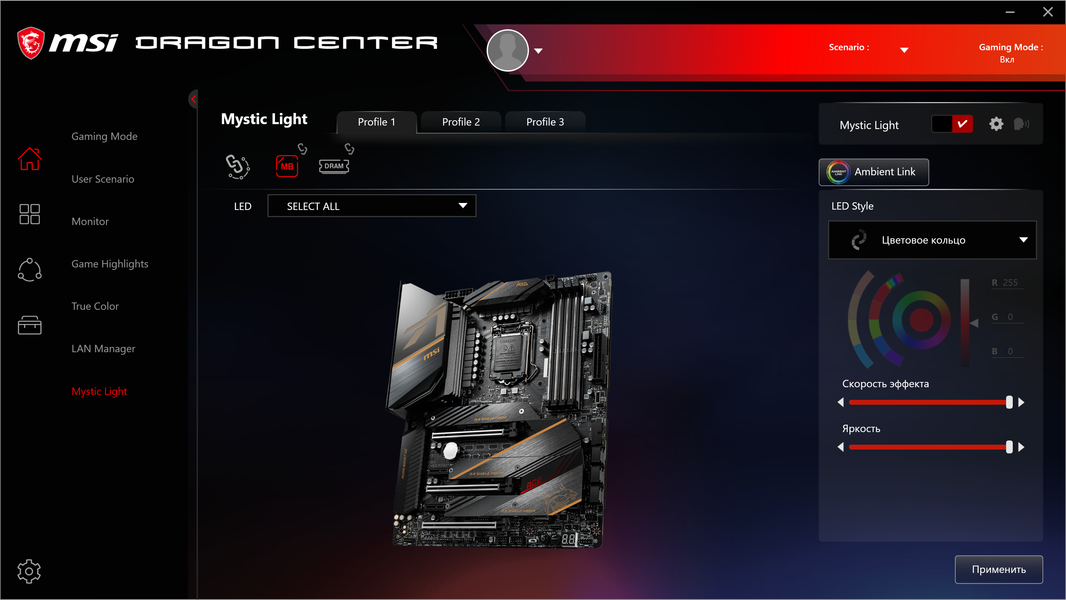 Вначале рассмотрим раздел управления подсветкой Mystic Light.
