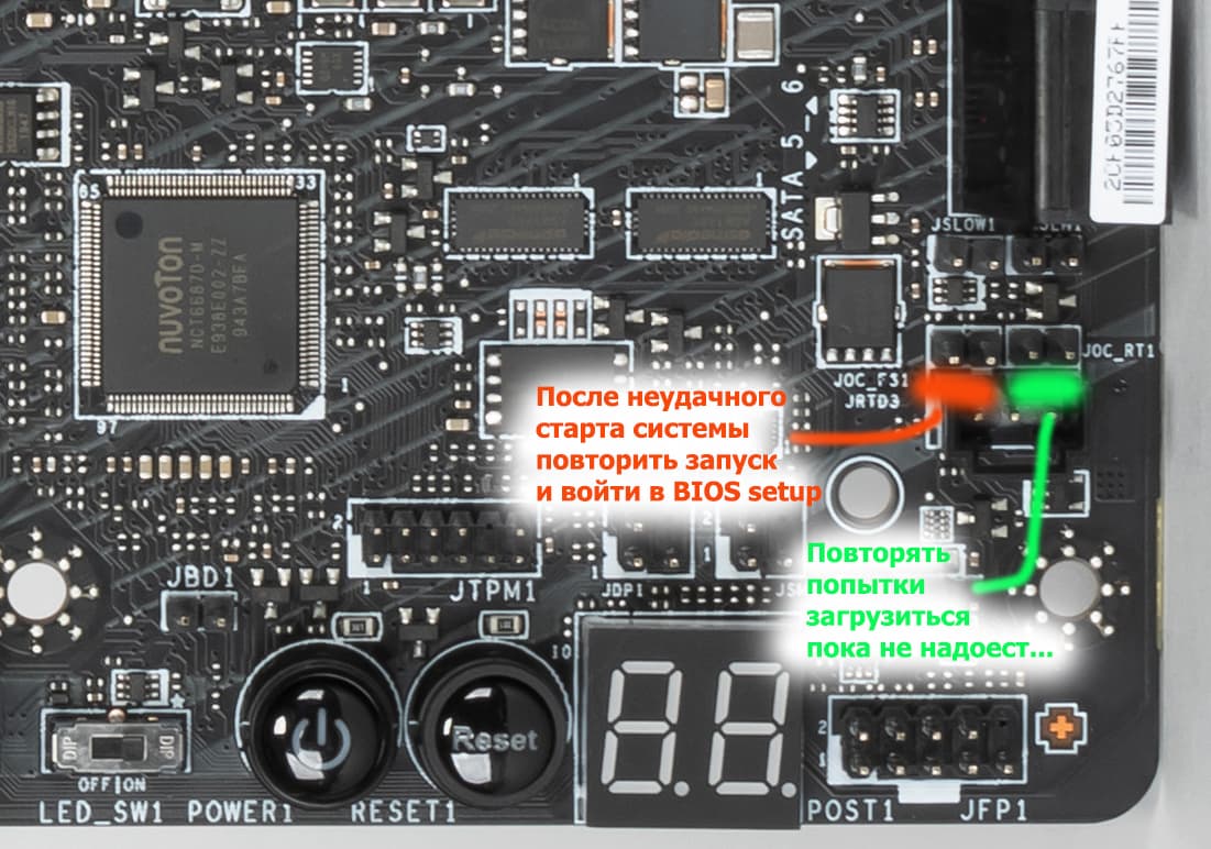 В-четвертых, перемычка для зануд. Кто все же не хочет сбрасывать оверклокерские настройки и заставить систему с ними запуститься. Ну и в-пятых, если уж все же запуск не получается, то хотя бы принудительно войти в настройки BIOS (CMOS) и подкрутить чего-нибудь.
