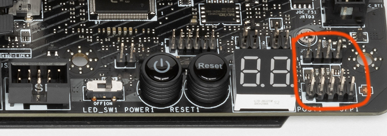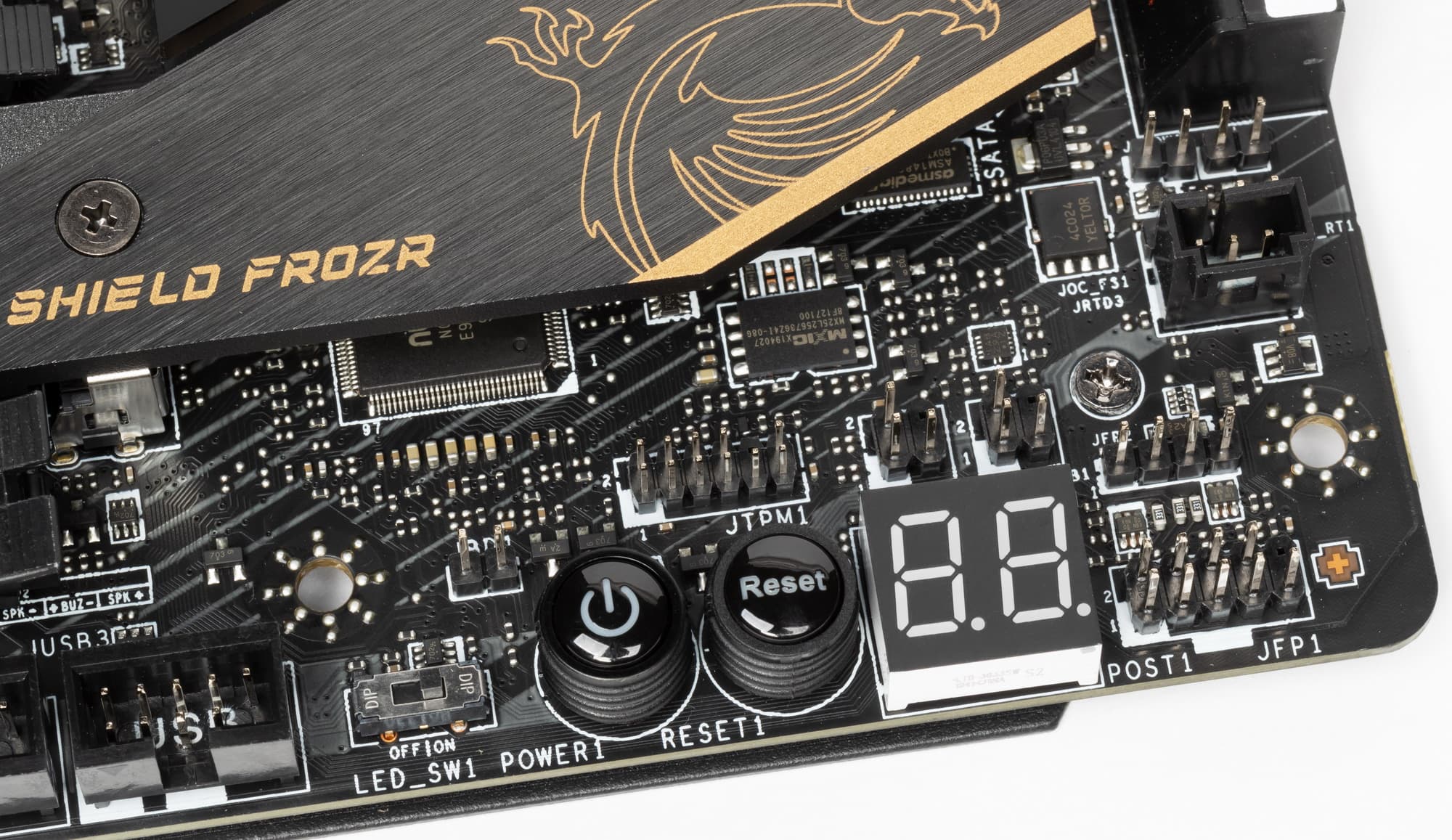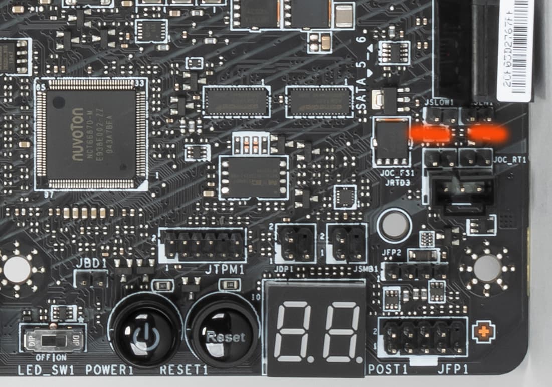 Расскажем и о других «прибамбасах» на плате. Разумеется, есть кнопки питания и перезагрузки. Рядом с ними табло POST-кодов (или Debug-кодов), извещающее о текущем состоянии платы в процессе запуска и работы.
