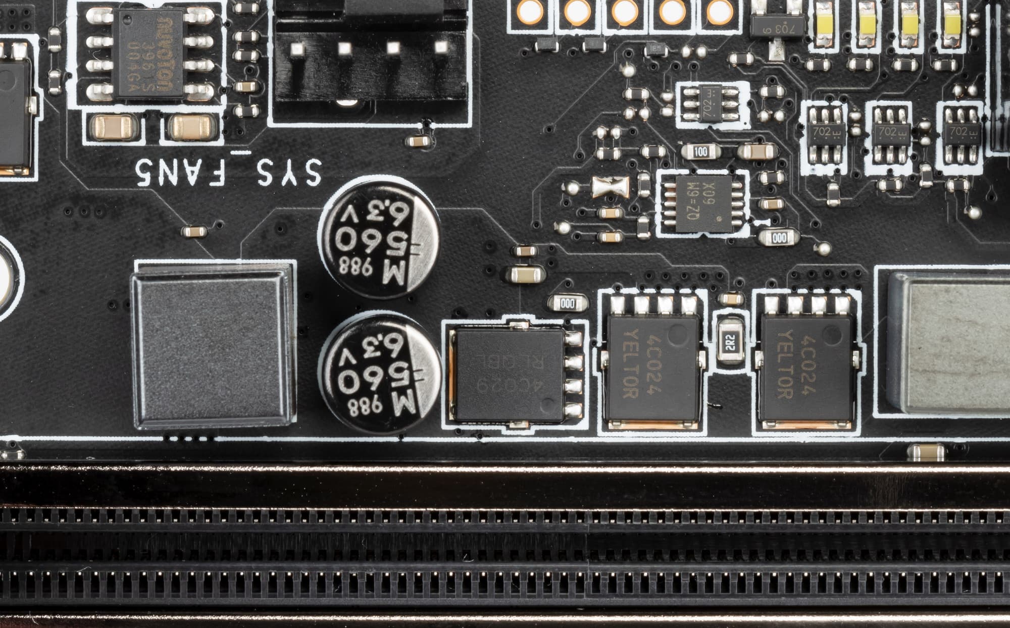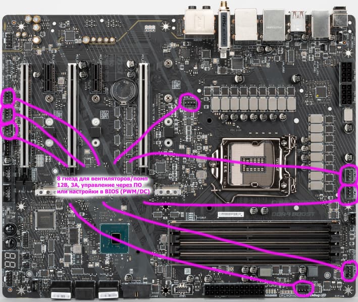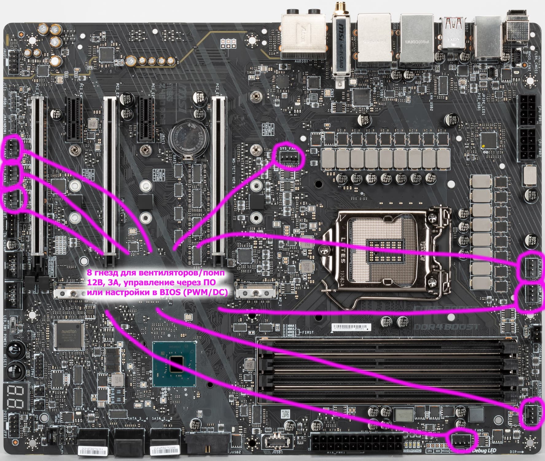 Через ПО или BIOS контролируется 8 гнезд для подключения воздушных вентиляторов или помп: они могут управляться как через ШИМ, так и банальным изменением напряжения/тока.