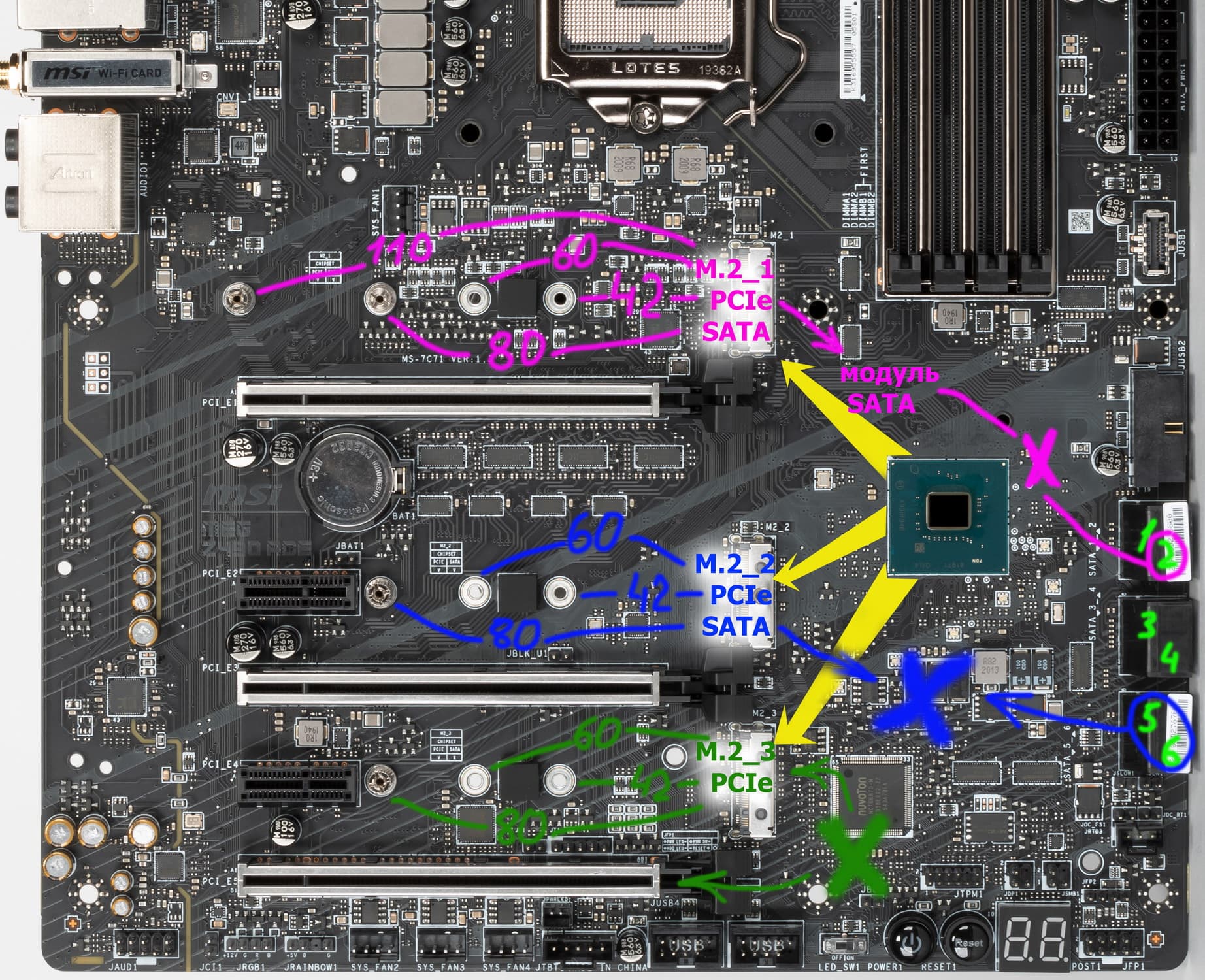 Поскольку количество HSIO линий у Z490 ограничено тридцатью, то приходится делить ресурсы, о чем я выше уже говорил, рассматривая PCIe слоты. В частности, повторю, что M.2_3 слот выключает PCIe x16_3, и наоборот. То есть в случае использования всех трех PCIe x16 (для AMD CrossFire, например) порт M.2_3 будет отключен. Если в слот M.2_1 вставлен накопитель с интерфейсом SATA, то это автоматом отключит порт SATA_2 (ну и наоборот, если последний задействован, то слот M.2_1 будет работать только в режиме PCIe x4). Слот M.2_2 не может работать одновременно с портами SATA_5/6, то есть тут тоже придется выбирать.