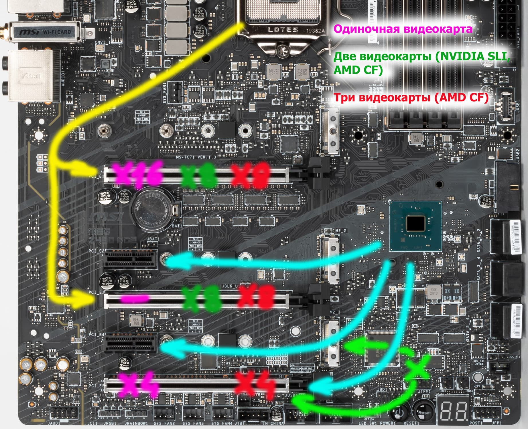 - Слот PCIe x16_1 имеет 8 линий, слот PCIe x16_2 имеет 8 линий (две видеокарты, режимы Nvidia SLI, AMD CrossFire)