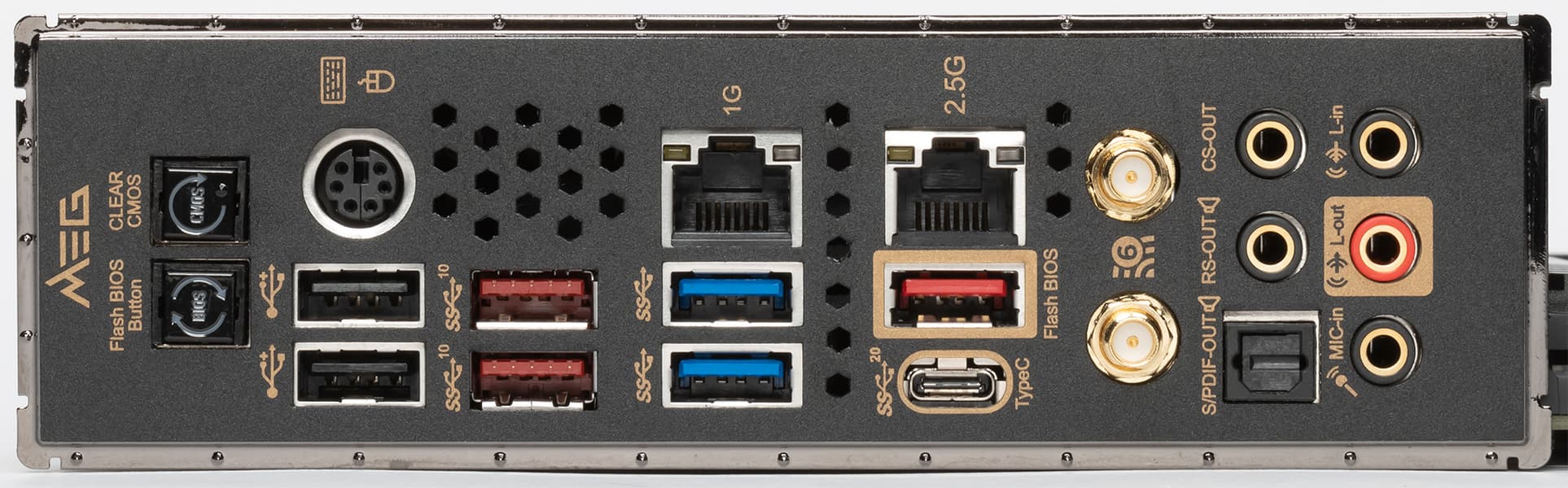 | Разъемы на задней панели | 1 × USB 3.2 Gen2x2 (Type-C) 3 × USB 3.2 Gen2 (Type-A) 2 × USB 3.2 Gen1 (Type-A) 2 × USB 2.0 (Type-A) 2 × RJ-45 5 аудиоразъемов типа миниджек 1 × S/PDIF (оптический, выход) 1 × PS/2 комбинированный разъем 2 антенных разъема кнопка сброса CMOS кнопка перепрошивки BIOS — Flash BIOS |