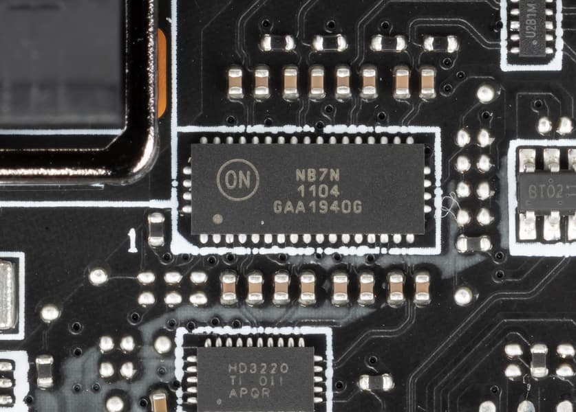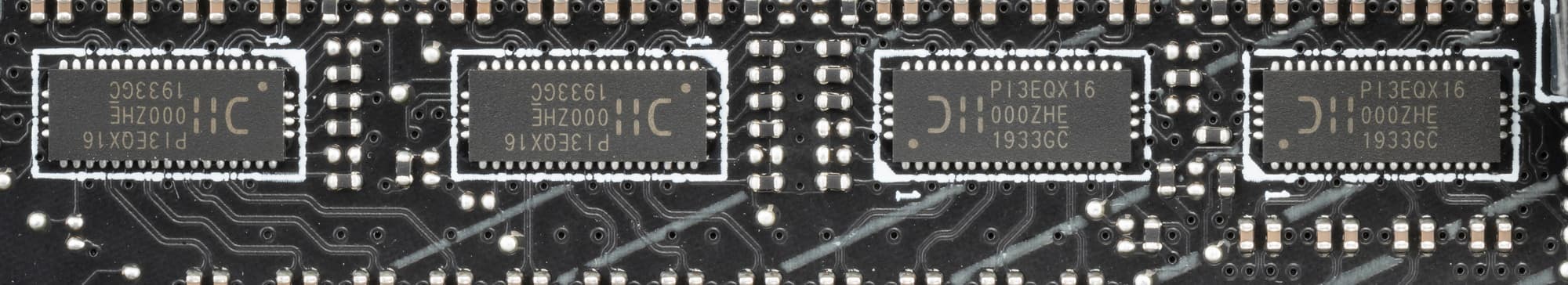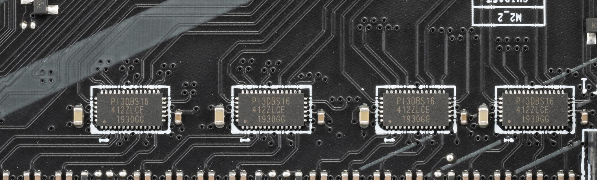 У данной платы перераспределение линий PCIe между слотами в случае использования более одной видеокарты, а также необходимо переключение слотов PCIe x16_3 и M.2_3, поэтому востребованы мультиплексоры PI3DBS16 от Pericom.