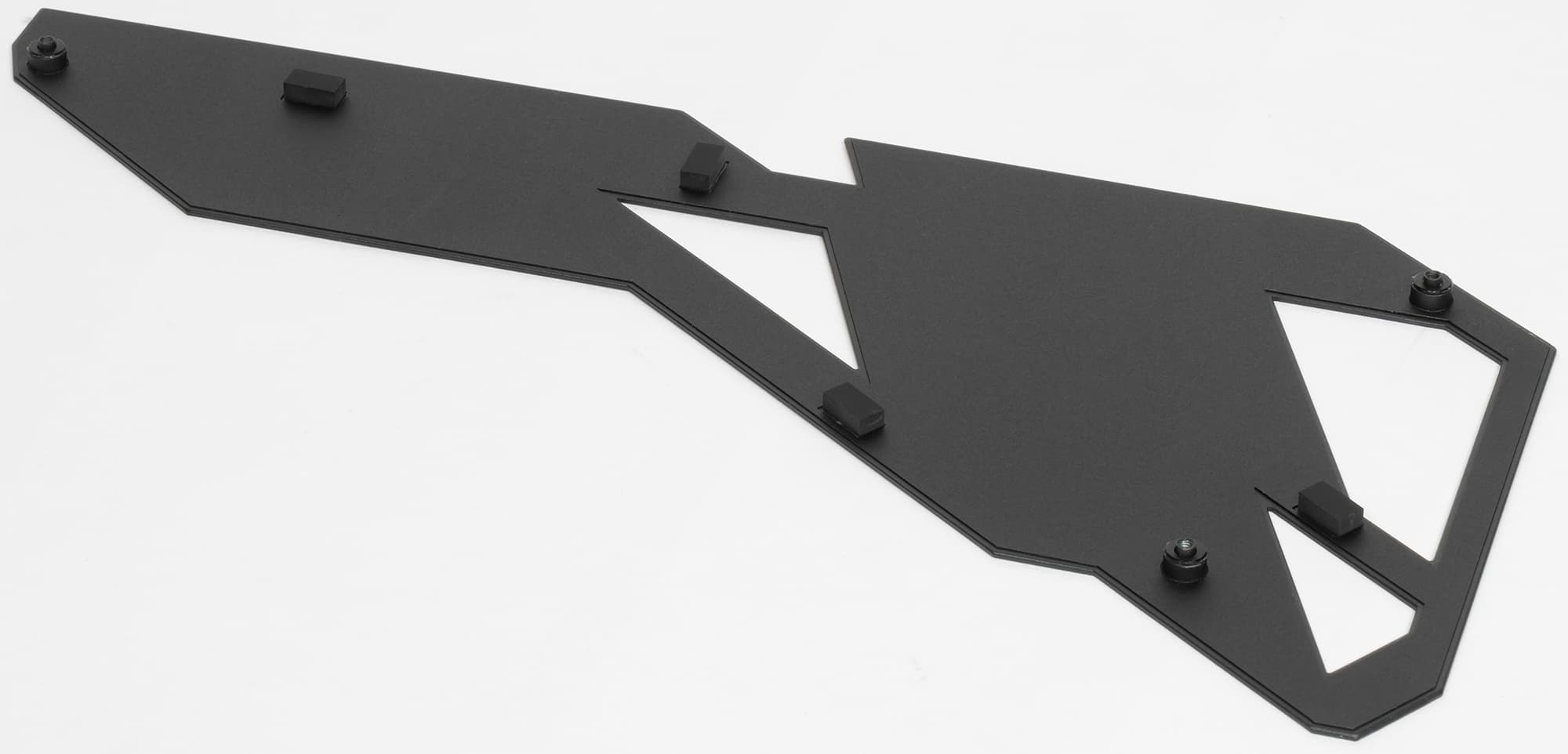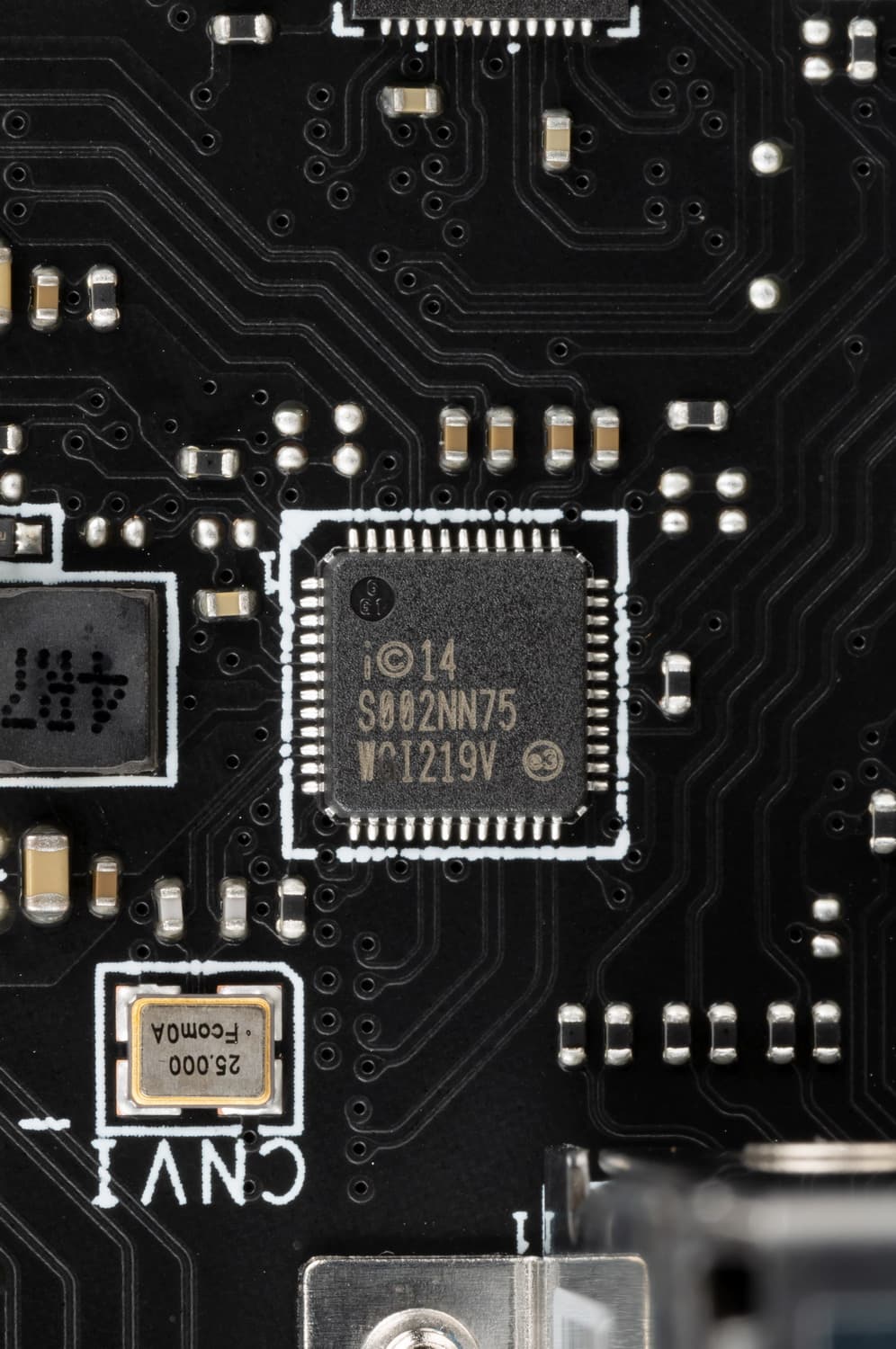 На оборотной стороне элементы имеется лишь мелкая логика. Обработан текстолит неплохо: во всех точках пайки срезаны острые концы срезаны. Также плата частично закрыта металлической защитной пластиной с электроизолирующим покрытием (пластина помогает относительно тяжелой плате сохранять жесткость PCB).