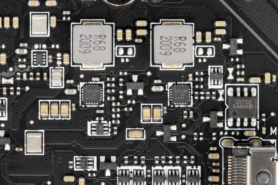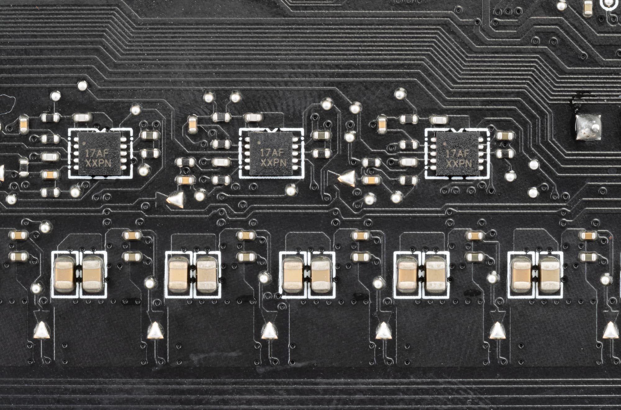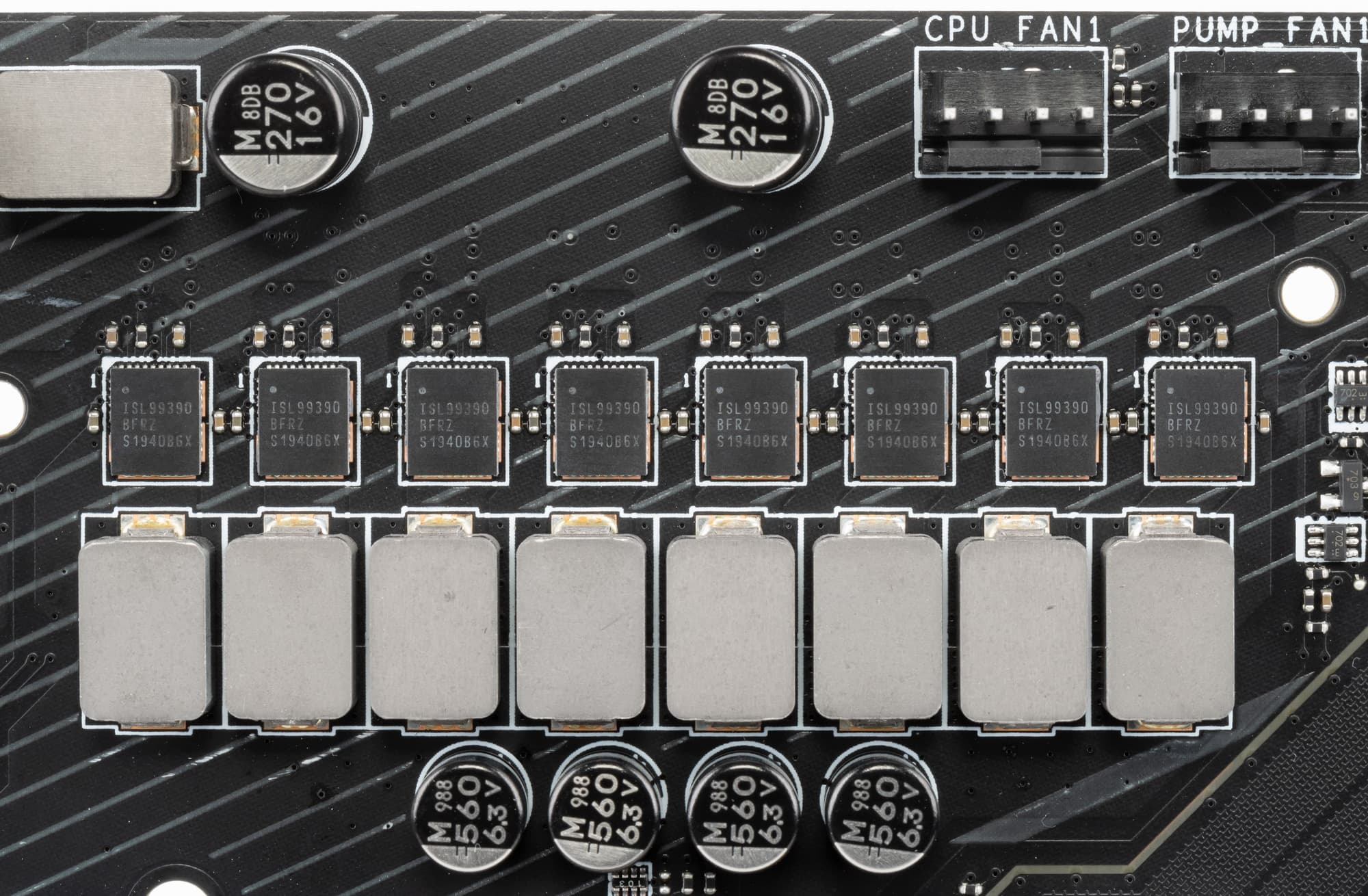 Каждый канал фазы имеет суперферритовую катушку и ISL99390 MOSFET от Intersil (Renesas Electronics) на 90 А.