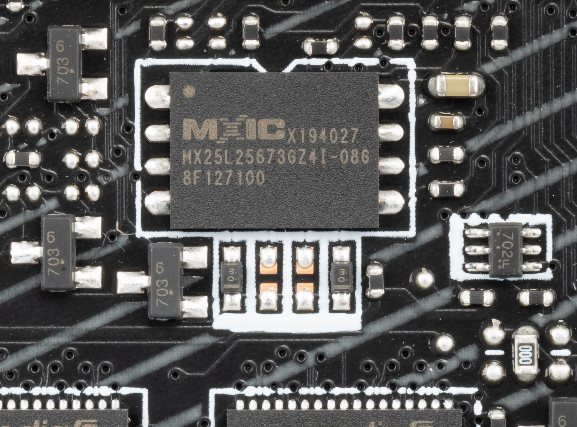 Для размещения прошивки UEFI/BIOS использована микросхема MXIC MX25L25673GZ4I от Macronix.
