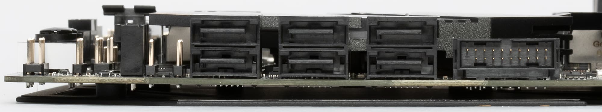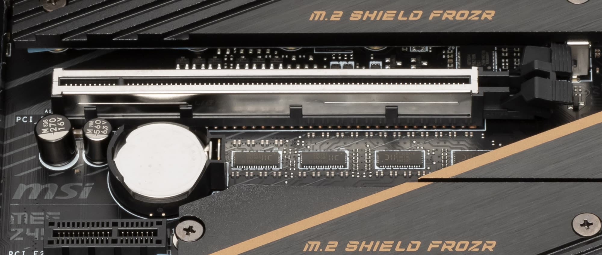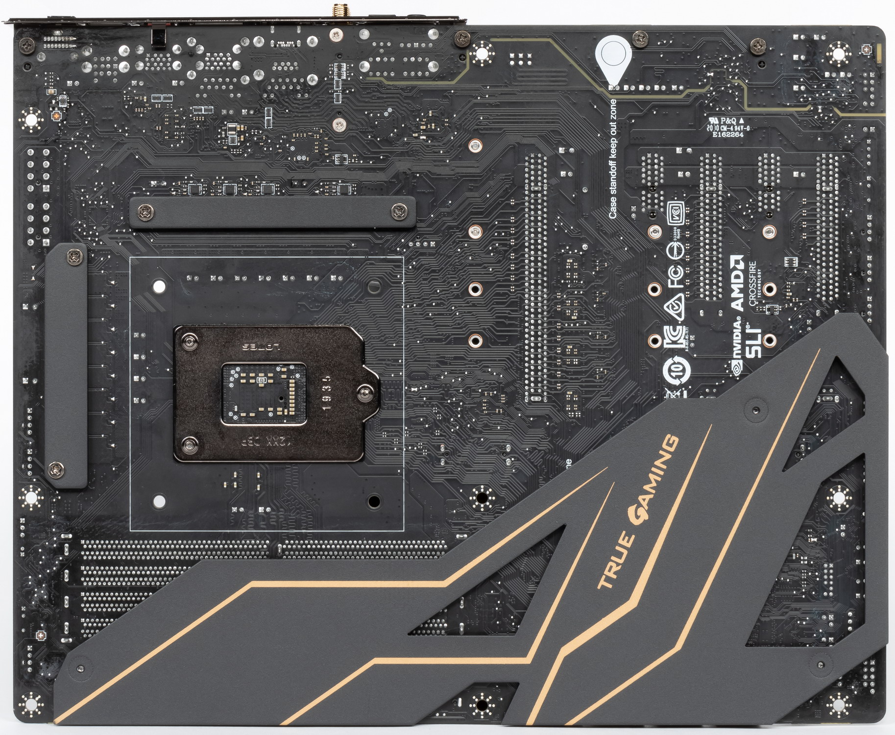 Всего у платы 6 разъемов Serial ATA 6 Гбит/с + 3 слота для накопителей в форм-факторе M.2. (Еще один слот M.2, спрятанный под кожухом блока разъемов задней панели, занят контроллером беспроводных сетей Wi-Fi/Bluetooth.). Все порты SATA реализованы через чипсет Z490 и поддерживают создание RAID.
