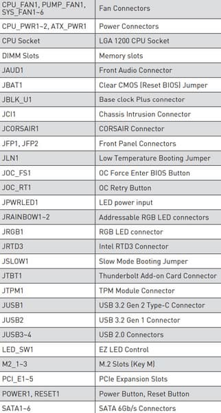 | Прочие внутренние элементы | 24-контактный разъем питания ATX 2 8-контактных разъема питания EPS12V 1 слот M.2 (E-key), занят адаптером беспроводных сетей 1 разъем для подключения порта USB 3.2 Gen2 Type-C 1 разъем для подключения 2 портов USB 3.2 Gen1 2 разъема для подключения 4 портов USB 2.0 8 разъемов для подключения 4-контактных вентиляторов и помп ЖСО 1 разъем для подключения неадресуемой RGB-ленты 2 разъема для подключения адресуемой ARGB-ленты 1 разъем для подключения подсветки от Corsair 1 разъем аудио для передней панели корпуса 1 разъем Thunderbolt 1 разъем TPM 1 разъем для термодатчика 2 разъема для подключения управления с передней панели корпуса 1 разъем сброса CMOS 1 разъем повышения базовой частоты 1 разъем для запуска при низкой температуре 1 разъем для принудительного входа в настройки BIOS 1 разъем для подключения кнопки повторного запуска 1 переключатель светодиодов состояния системы 1 кнопка включения питания Power 1 кнопка перезагрузки Reset |