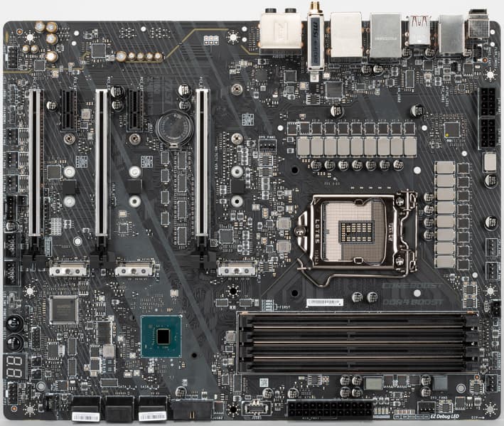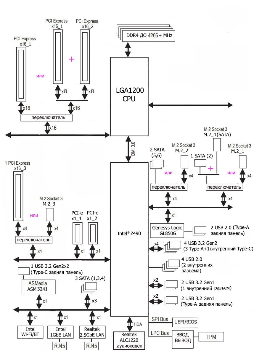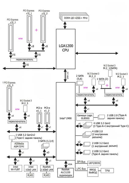 Процессоры Intel Core 10-го поколения (совместимые с сокетом LGA1200 и поддерживаемые Z490) имеют 16 линий ввода-вывода (включая PCIe 3.0), не имеют USB и SATA портов. При этом взаимодействие с Z490 идет по особому каналу Digital Media Interface 3.0 (DMI 3.0), и линии PCIe на это не расходуются. Все PCIe линии процессора идут на слоты расширения PCIe. Serial Peripheral Interface (SPI) используется для взаимодействия с системой UEFI/BIOS, а шина Low Pin Count (LPC) — для связи с устройствами ввода/вывода, не требующими высокой пропускной способности (контроллерами вентиляторов, TPM, старой периферии).