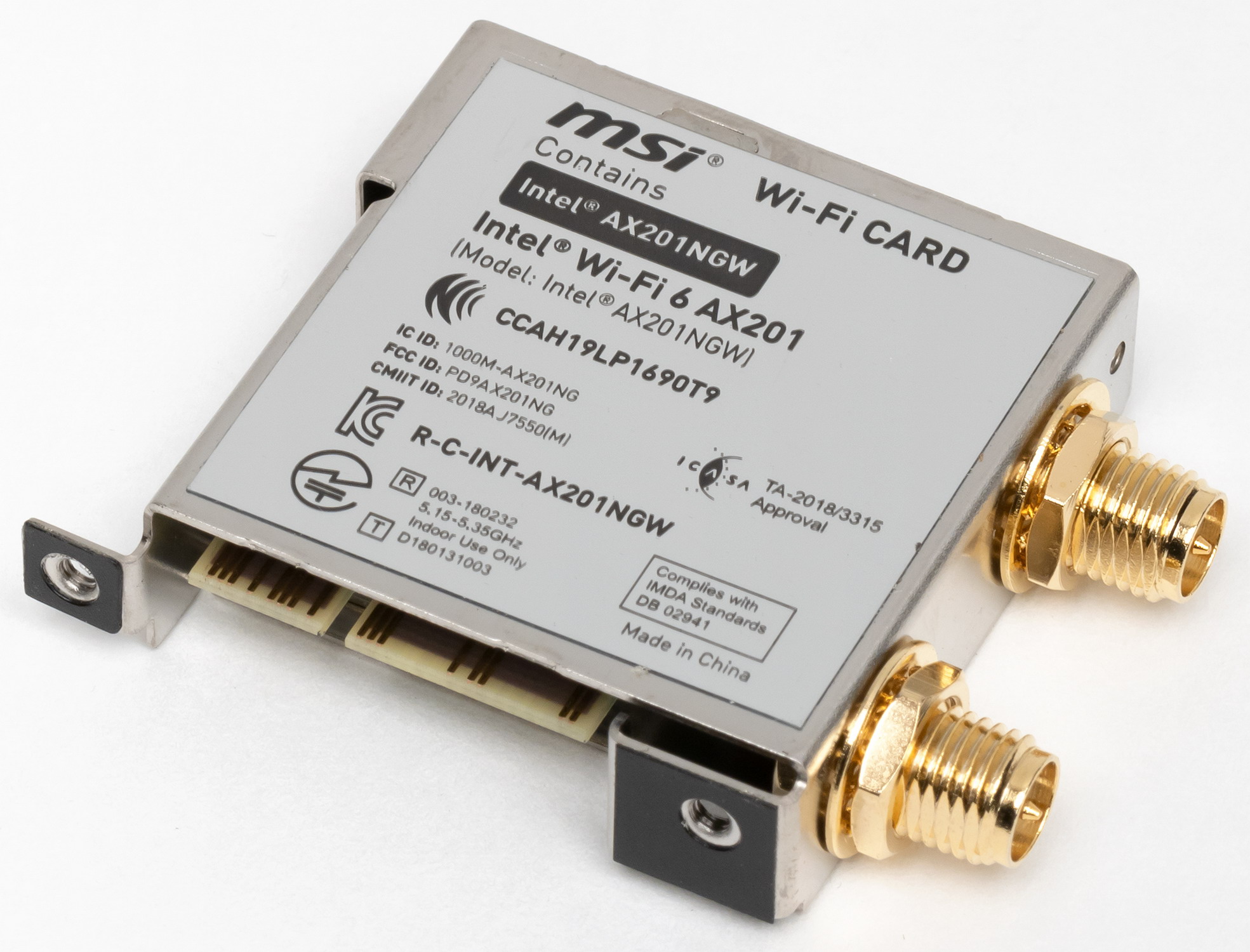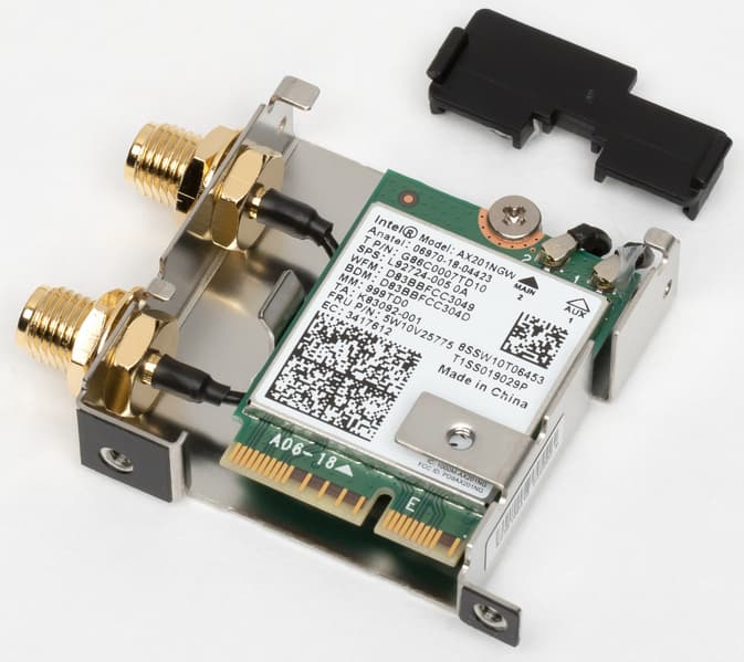 Имеется и комплексный беспроводной адаптер на контроллере Intel AX201NGW, через который реализованы Wi-Fi (802.11a/b/g/n/ac/ax) и Bluetooth 5.0. Он установлен в слот M.2 (E-key), и его разъемы для привинчивания выносных антенн выведены на заднюю панель.
