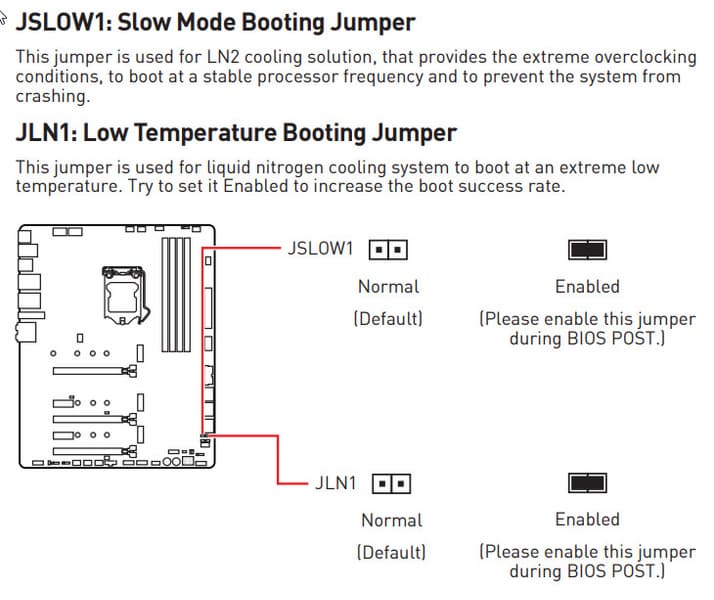 Во-вторых, перемычка включения режима LN2, и в случае экстремального разгона (приведшего к зависанию ПК), ищется ближайшая частота работы CPU для гарантированного стабильного запуска.