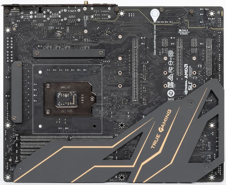 Форм-фактор ATX имеет размеры до 305×244 мм, а E-ATX — до 305×330 мм. Материнская плата MSI MEG Z490 Ace имеет размеры 305×244 мм, поэтому выполнена в форм-факторе ATX, и на ней имеются 9 монтажных отверстий для установки в корпус (одно отверстие по центру скрыто радиатором слота M.2, поэтому если кому важно, для крепления матплаты через это отверстие придется снять оный).