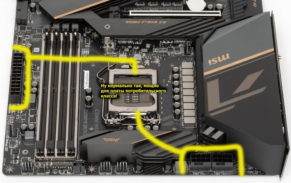 Система питания очень внушительная. Схема питания ядра выполнена по схеме 16+1 фаза.