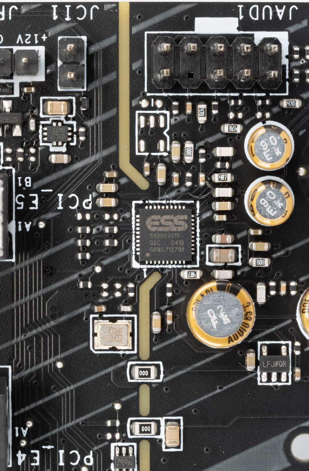 Аудиотракт вынесен на угловую часть платы, не пересекается с другими элементами. Разумеется, левый и правый каналы разведены по разным слоям печатной платы. Все аудиоразъемы на задней панели имеют позолоченное покрытие, но не сохранена привычная цветовая окраска разъемов (которая неплохо помогает подключать нужные штекеры без вглядывания в их наименование).