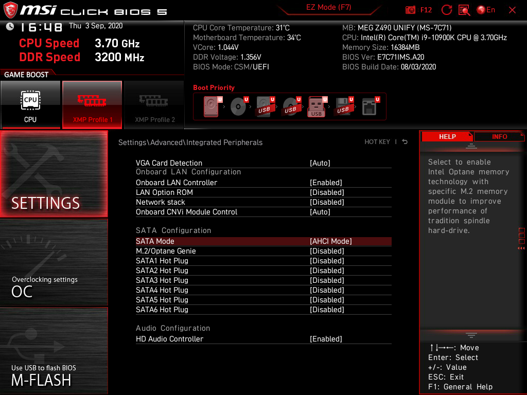 Всего у платы 6 разъемов Serial ATA 6 Гбит/с + 3 слота для накопителей в форм-факторе M.2. (Еще один слот M.2, спрятанный под кожухом блока разъемов задней панели, занят контроллером беспроводных сетей Wi-Fi/Bluetooth.). Все порты SATA реализованы через чипсет Z490 и поддерживают создание RAID.