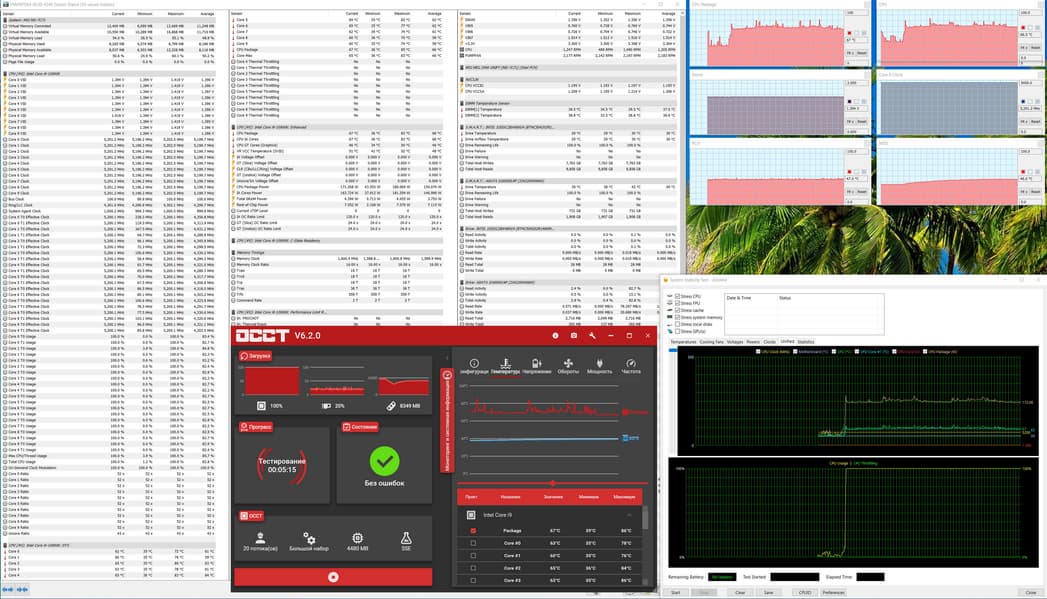 Опять же, по традиции использовал фирменную утилиту Dragon Center для получения более высоких результатов, выставив там режим экстремальной производительности. И тут уже произошла разница. Если ранее программа выставляла 5,3 ГГц по всем ядрам, что вызывало легкий троттлинг, то теперь... всего 5,0 ГГц. Ну это никуда не годится. Так что я воспользовался ручными настройками в BIOS и выставил 5,2 ГГц по всем ядрам, отключив все лимиты, а к вольтажам добавил 0,08 В. В принципе, можно просто схему питания выставить в режим Turbo и все. И получил прекрасную стабильность в работе, тест OCCT прошел на ура (на скриншоте лишь его начало)