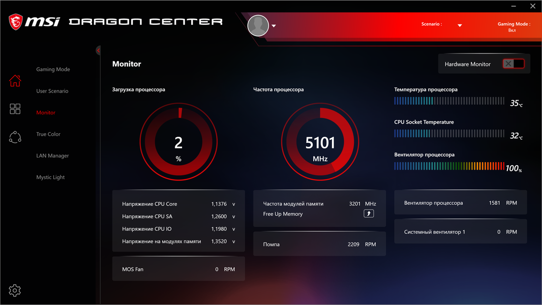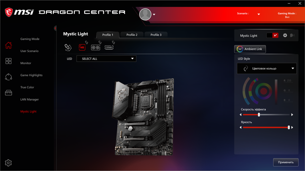 Топовые платы MSI (как и других производителей) обычно имеют красивую подсветку. Однако именно особенностью дизайна данной платы, несмотря на принадлежность к MEG, является полное отсутствие встроенной подсветки. Тем не менее, мы помним, что есть 4 разъема для подключения внешней подсветки, и всем этим можно управлять через программу Dragon Center.