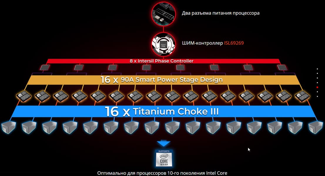 Система питания очень внушительная. Схема питания ядра выполнена по схеме 16+1 фаза.