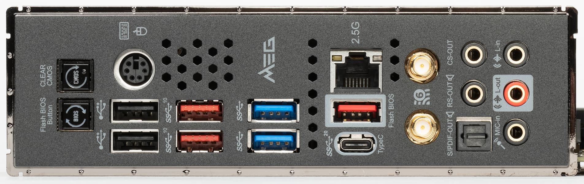 | Разъемы на задней панели | 1 × USB 3.2 Gen2x2 (Type-C) 3 × USB 3.2 Gen2 (Type-A) 2 × USB 3.2 Gen1 (Type-A) 2 × USB 2.0 (Type-A) 1 × RJ-45 5 аудиоразъемов типа миниджек 1 × S/PDIF (оптический, выход) 1 × PS/2 комбинированный разъем 2 антенных разъема кнопка сброса CMOS кнопка перепрошивки BIOS — Flash BIOS |