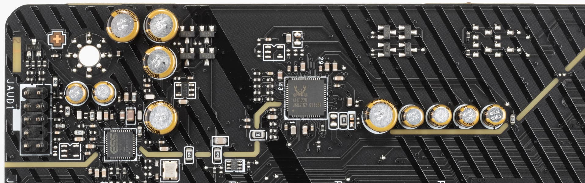 Аудиотракт вынесен на угловую часть платы, не пересекается с другими элементами. Разумеется, левый и правый каналы разведены по разным слоям печатной платы. Все аудиоразъемы на задней панели имеют позолоченное покрытие, но не сохранена привычная цветовая окраска разъемов (которая неплохо помогает подключать нужные штекеры без вглядывания в их наименование).