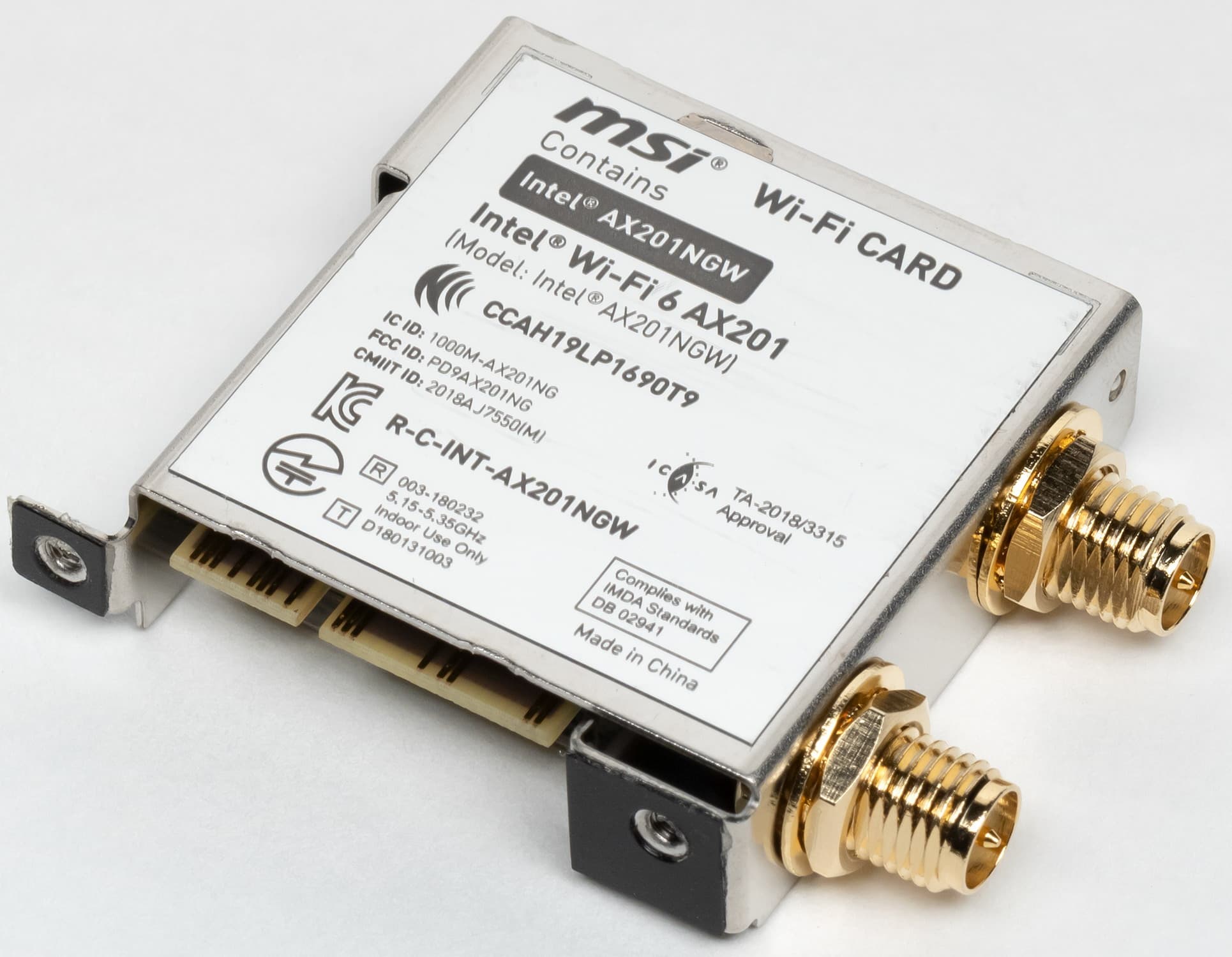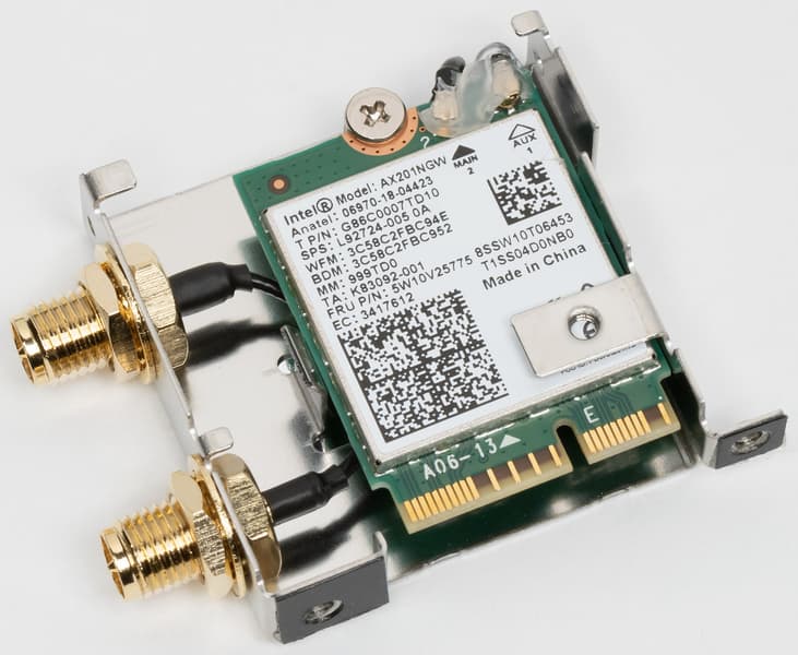 Имеется и комплексный беспроводной адаптер на контроллере Intel AX201NGW, через который реализованы Wi-Fi (802.11a/b/g/n/ac/ax) и Bluetooth 5.0. Он установлен в слот M.2 (E-key), и его разъемы для привинчивания выносных антенн выведены на заднюю панель.