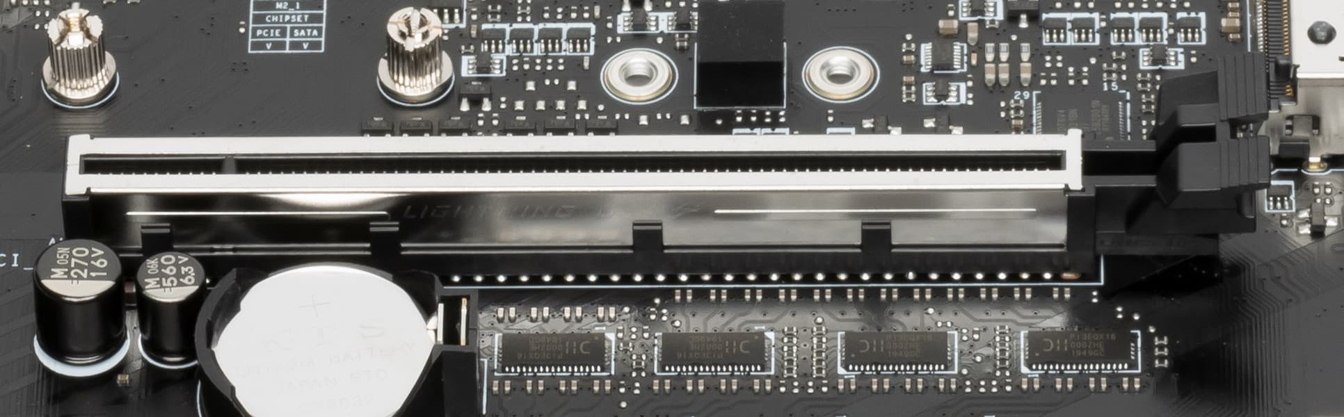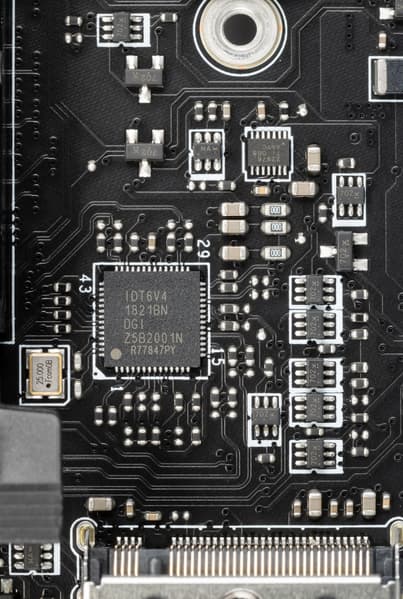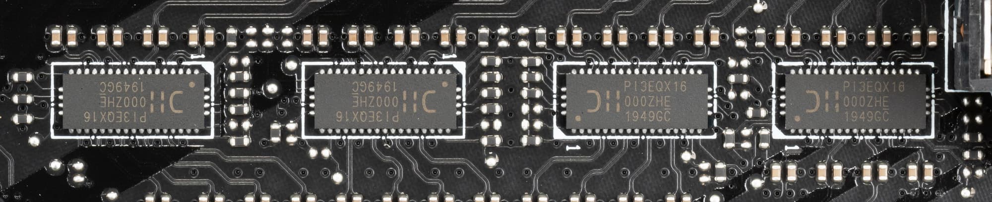 У данной платы перераспределение линий PCIe между слотами в случае использования более одной видеокарты, а также необходимо переключение слотов PCIe x16_3 и M.2_3, поэтому востребованы мультиплексоры PI3DBS16 от Pericom/Diodes.