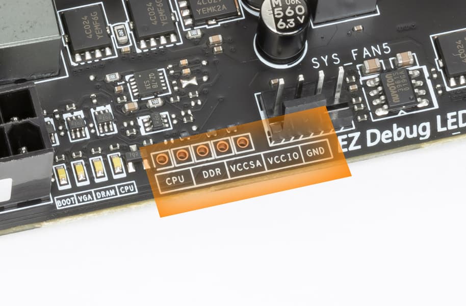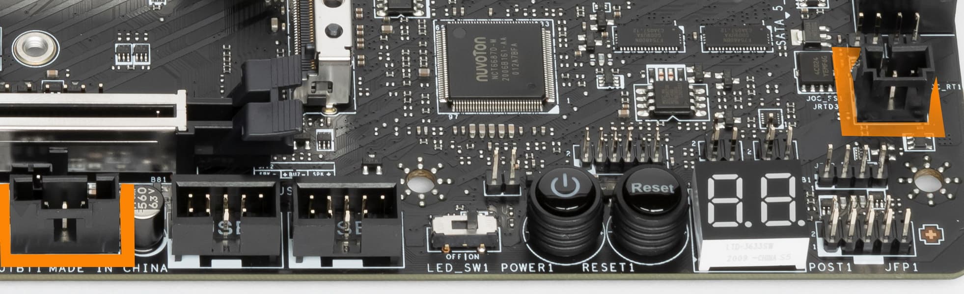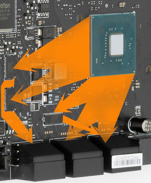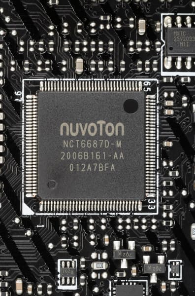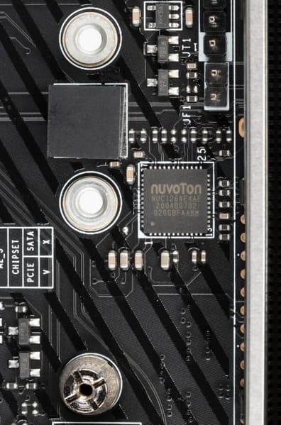 За мониторинг платы отвечают два небольших контроллера от Nuvoton (включая вышеупомянутый NUC126). C ними связан Nuvoton NCT6687D, который контролирует работу всех гнезд СО, также в его ведении Multi I/O.