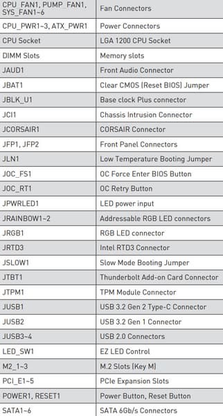 | Прочие внутренние элементы | 24-контактный разъем питания ATX 2 8-контактных разъема питания EPS12V 1 слот M.2 (E-key), занят адаптером беспроводных сетей 1 разъем для подключения порта USB 3.2 Gen2 Type-C 1 разъем для подключения 2 портов USB 3.2 Gen1 2 разъема для подключения 4 портов USB 2.0 8 разъемов для подключения 4-контактных вентиляторов и помп ЖСО 1 разъем для подключения неадресуемой RGB-ленты 2 разъема для подключения адресуемой ARGB-ленты 1 разъем для подключения подсветки от Corsair 1 разъем аудио для передней панели корпуса 2 разъема для подключения контроллера Intel Thunderbolt3 1 разъем TPM 2 разъема для подключения управления с передней панели корпуса 1 разъем сброса CMOS 1 разъем повышения базовой частоты 1 разъем для запуска при низкой температуре 1 кнопка для принудительного входа в настройки BIOS 1 кнопка для подключения кнопки повторного запуска 1 переключатель светодиодов состояния системы 1 кнопка включения питания Power 1 кнопка перезагрузки Reset |