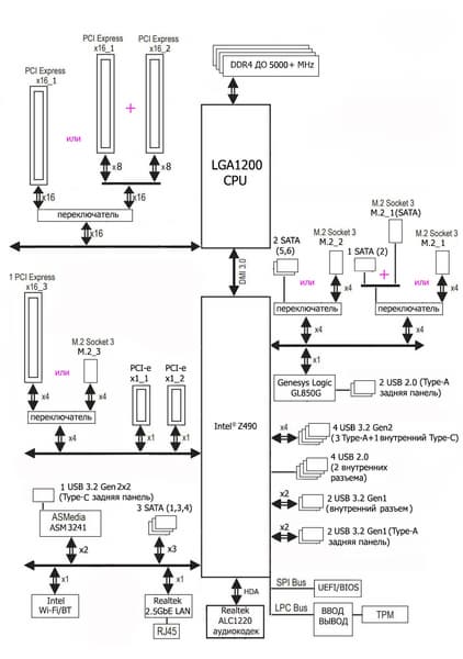 Процессоры Intel Core 10-го поколения (совместимые с сокетом LGA1200 и поддерживаемые Z490) имеют 16 линий ввода-вывода (включая PCIe 3.0), не имеют USB и SATA портов. При этом взаимодействие с Z490 идет по особому каналу Digital Media Interface 3.0 (DMI 3.0), и линии PCIe на это не расходуются. Все PCIe линии процессора идут на слоты расширения PCIe. Serial Peripheral Interface (SPI) используется для взаимодействия с системой UEFI/BIOS, а шина Low Pin Count (LPC) — для связи с устройствами ввода/вывода, не требующими высокой пропускной способности (контроллерами вентиляторов, TPM, старой периферии).