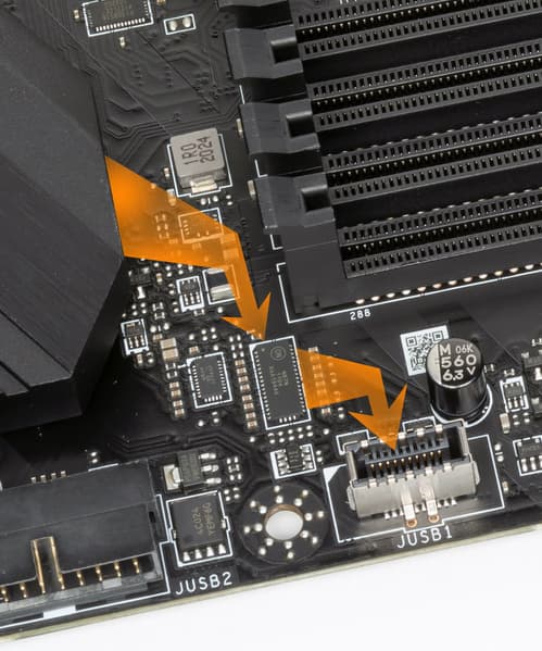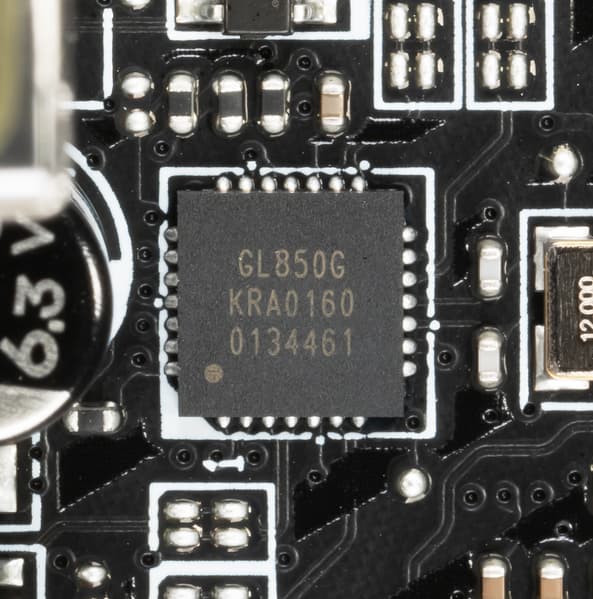 - 6 портов USB 2.0/1.1: 4 реализованы через Z490 и представлены двумя внутренними разъемами (каждый на 2 порта); еще 2 реализованы через контроллер Genesys Logic GL850G (на него потрачена 1 линия PCIe) и представлены портами Type-A на задней панели (черные).
