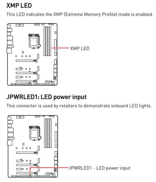 Также имеются световой индикатор активности XMP-профиля работы памяти и коннектор для демонстрации возможностей подсветки платы без ее включения.