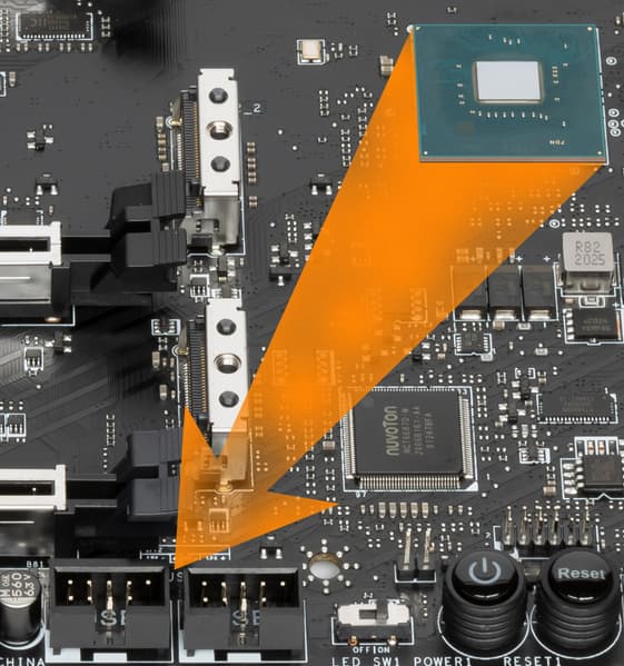 - Переключатель: или порты SATA_5/6 (2 линии), или слот M.2_2 (4 линии): максимум 4 линии;