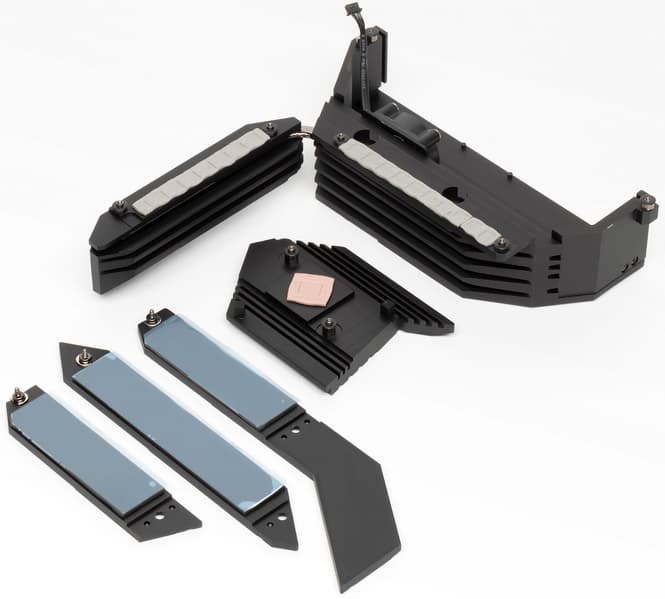 Все три M.2 слота на самой матплате имеют радиаторы, которые не связаны с какими-то иными устройствами охлаждения на данной плате (хоть радиаторы для М.2_2 и М.2_3 и выглядят единым целым с чипсетным радиатором, но это просто дизайн).