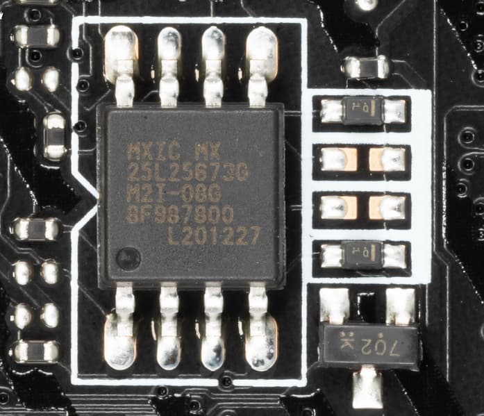 Для размещения прошивки UEFI/BIOS использована микросхема MXIC MX25L25673GM2I от Macronix.