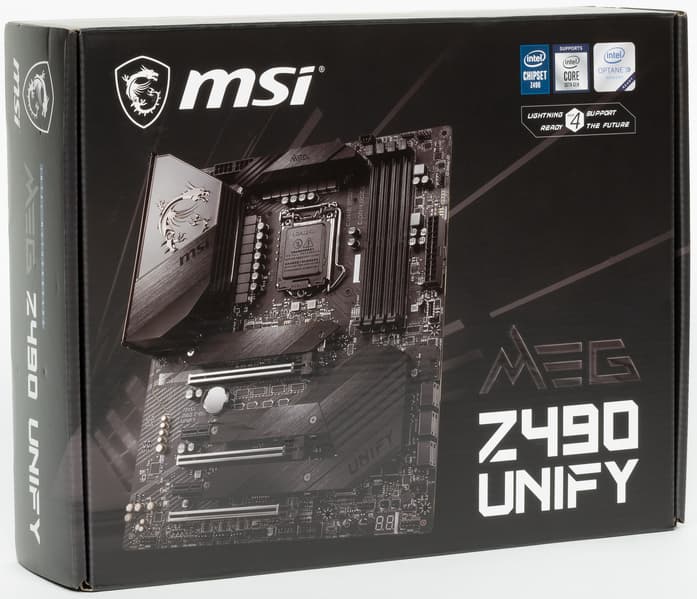 MSI MEG Z490 Unify поставляется в стандартной коробке с фирменным дизайном серии MEG с подчеркиванием черного дизайна самой платы.