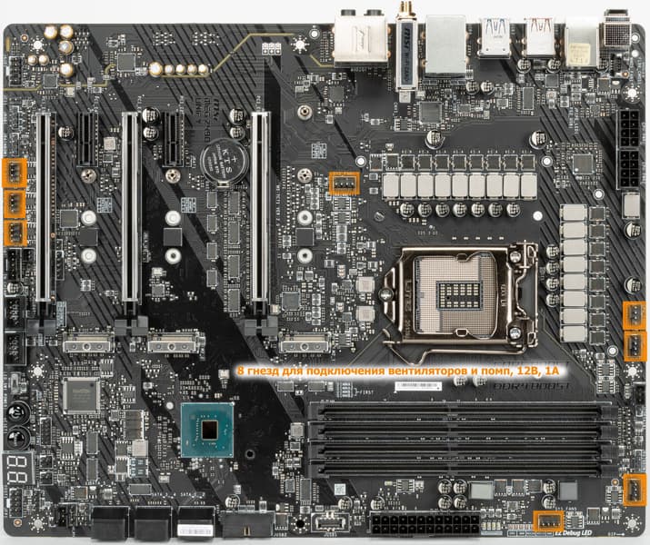 Через ПО или BIOS контролируется все 8 гнезд для подключения воздушных вентиляторов или помп: могут управляться как через ШИМ, так и банальным изменением напряжения/тока.
