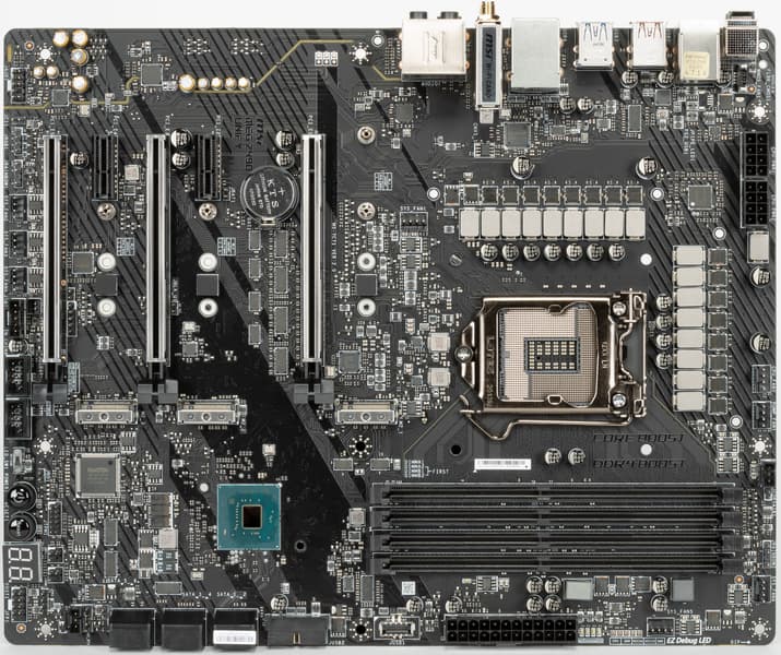 Плата предлагает 15 портов USB разных видов (включая один USB 3.2 Gen2×2 (20 Гбит/с) и 5 USB 3.2 Gen2 (10 Гбит/с), 3 слота PCIe х16 (первые два получают 16 линий PCIe от процессора с возможностью создать Nvidia SLI или AMD CrossFire, а третий работает только в режиме х4), 3 слота M.2, 6 портов SATA. Система питания способна обеспечить работу любых совместимых процессоров для нового сокета LGA1200 под серьезным разгоном. Плата имеет стильный черный дизайн без подсветки (но есть возможность подключения дополнительных RGB-устройств), в который отлично вписывается СО на силовых элементах системы питания, усиленная комплектным вентилятором, который в наших тестах ни разу не запустился, и дополненная 8 разъемами для подключения вентиляторов и помп, а также радиаторами для всех накопителей в слотах M.2. Также стоит упомянуть наличие проводного 2,5-гигабитного контроллера Ethernet и беспроводного контроллера, реализующего Wi-Fi 802.11ac и Bluetooth 5.0.