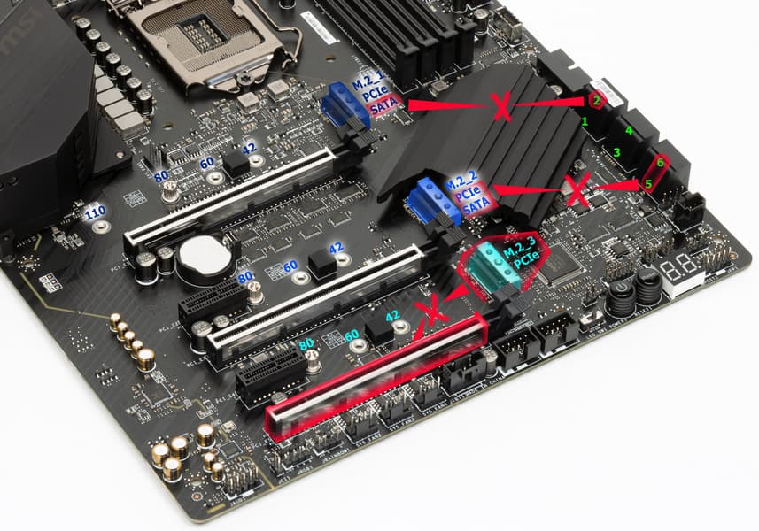 Поскольку количество HSIO линий у Z490 ограничено тридцатью, то приходится делить ресурсы, о чем я выше уже говорил, рассматривая PCIe слоты. В частности, повторю, что M.2_3 слот выключает PCIe x16_3, и наоборот. То есть в случае использования всех трех PCIe x16 (для AMD CrossFire, например) порт M.2_3 будет отключен. Если в слот M.2_1 вставлен накопитель с интерфейсом SATA, то это автоматом отключит порт SATA_2 (ну и наоборот, если последний задействован, то слот M.2_1 будет работать только в режиме PCIe x4). Слот M.2_2 не может работать одновременно с портами SATA_5/6, то есть тут тоже придется выбирать.