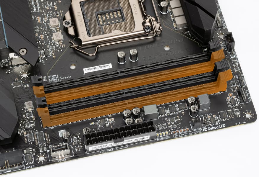 Для установки модулей памяти на плате MSI имеется четыре DIMM-слота (для работы памяти в Dual Channel в случае использования всего 2 модулей их следует устанавливать в А2 и B2. Плата поддерживает небуферизованную память DDR4 (non-EСС), а максимальный объем памяти составляет 128 ГБ (при использовании UDIMM последнего поколения по 32 ГБ). Поддерживаются профили XMP.