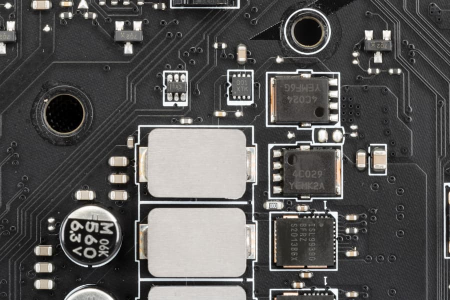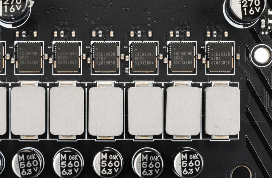 Каждый канал фазы имеет суперферритовую катушку и ISL99390 MOSFET от Intersil (Renesas Electronics) на 90 А.