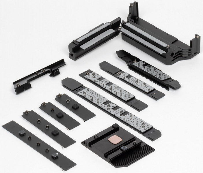 Все M.2 слоты имеют радиаторы. M.2_1/М.2_2/М.2_3 обладают отдельными радиаторами, когда как остальные слоты M.2_4/М.2_5 имеют общий радиатор.